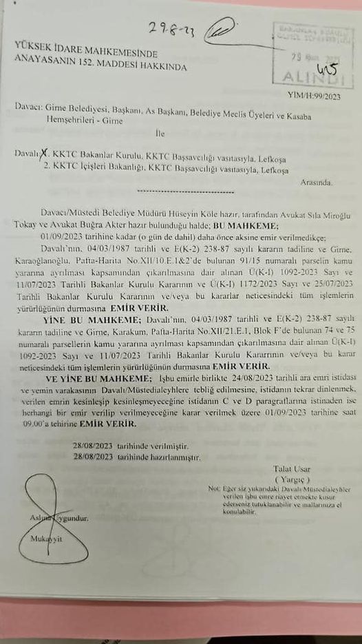 Girne Belediye Başkanı Murat Şenkul, Kervansaray plajında Girne Belediyesi'nin kullanımındaki parselin özel bir şirketin kullanımına verilmesiyle ilgili Bakanlar Kurulu kararına ara emri alındığını duyurdu.