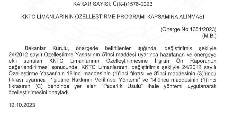 Bakanlar Kurulu, limanların özelleştirme programı kapsamına alınmasına karar verdi. Karara göre verilecek şirketler pazarlık usulü belirlenecek…