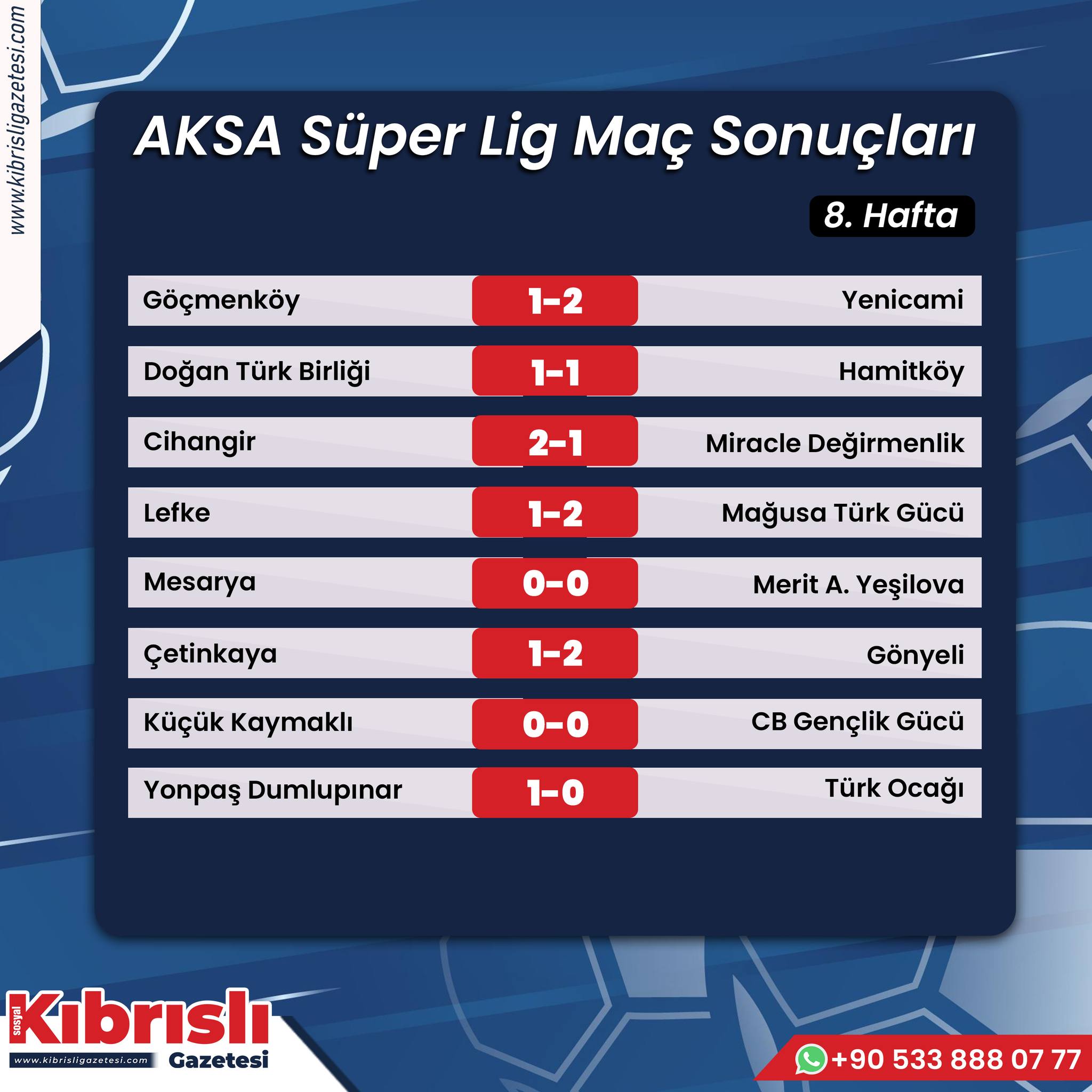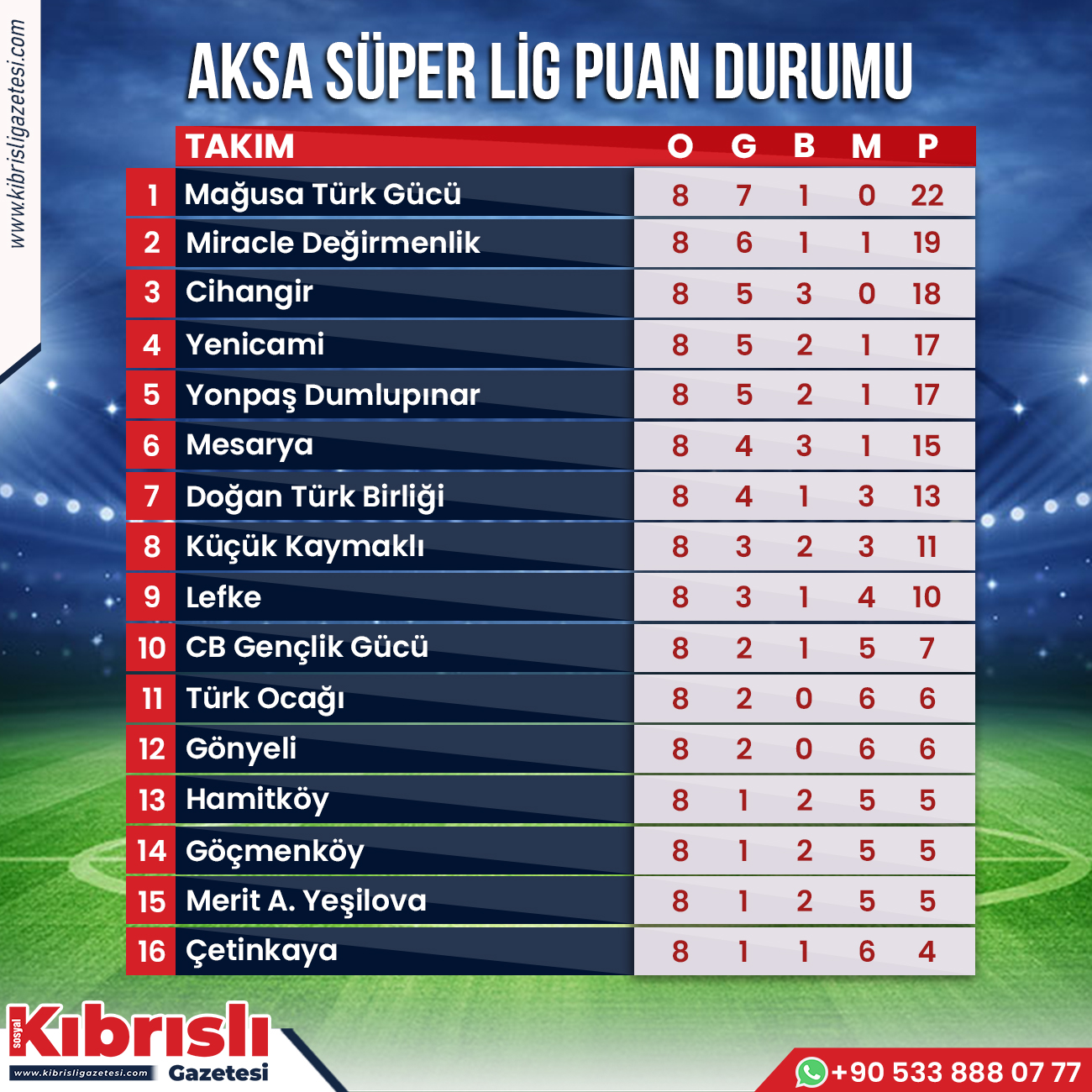 AKSA Süper Lig’de 8’inci hafta mücadeleleri tamamlandı. Mağusa Türk Gücü deplasmanda Lefke’yi 2-1’lik skorla yenmeyi başararak, haftayı puan farkı ile lider tamamladı.