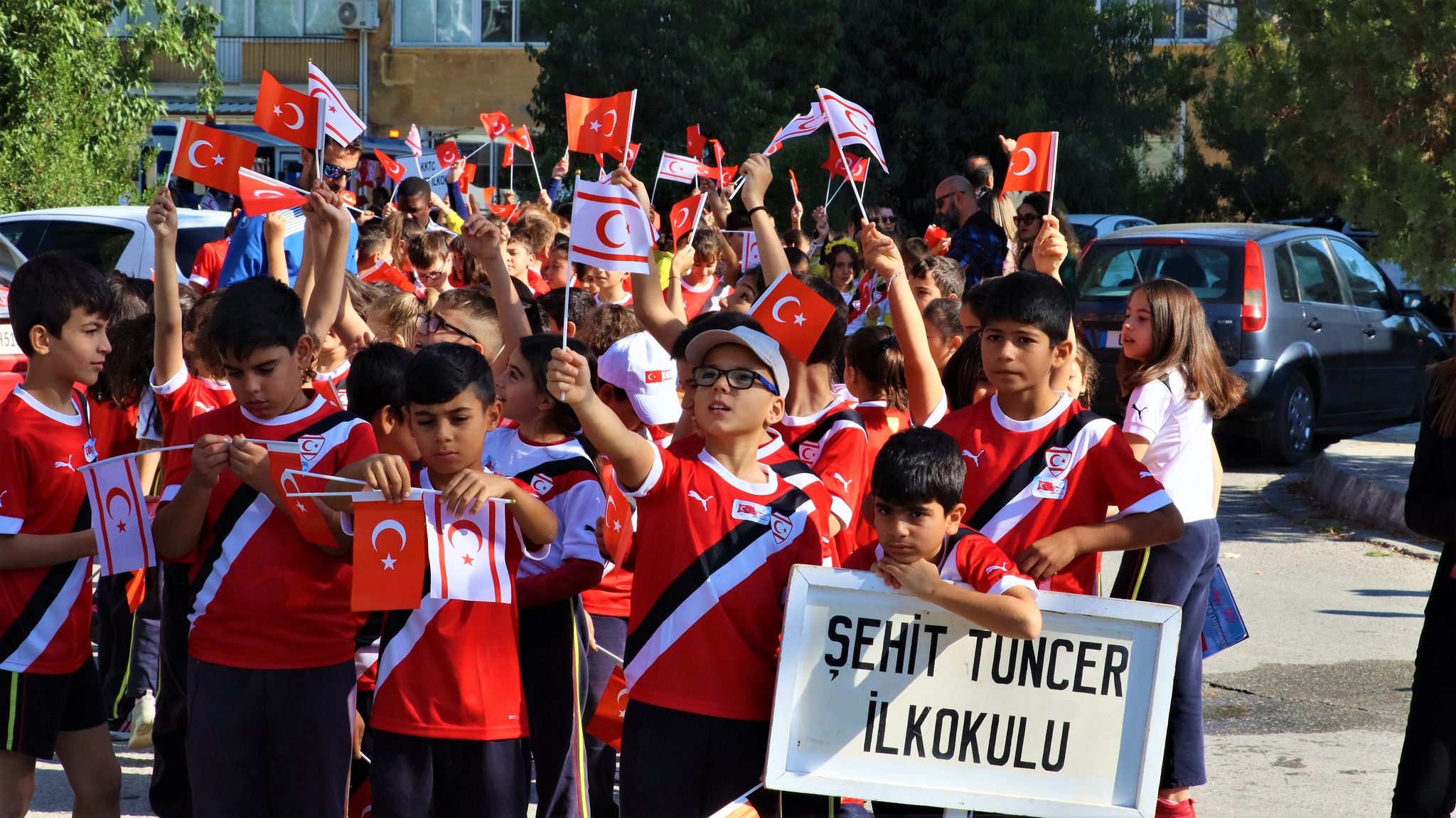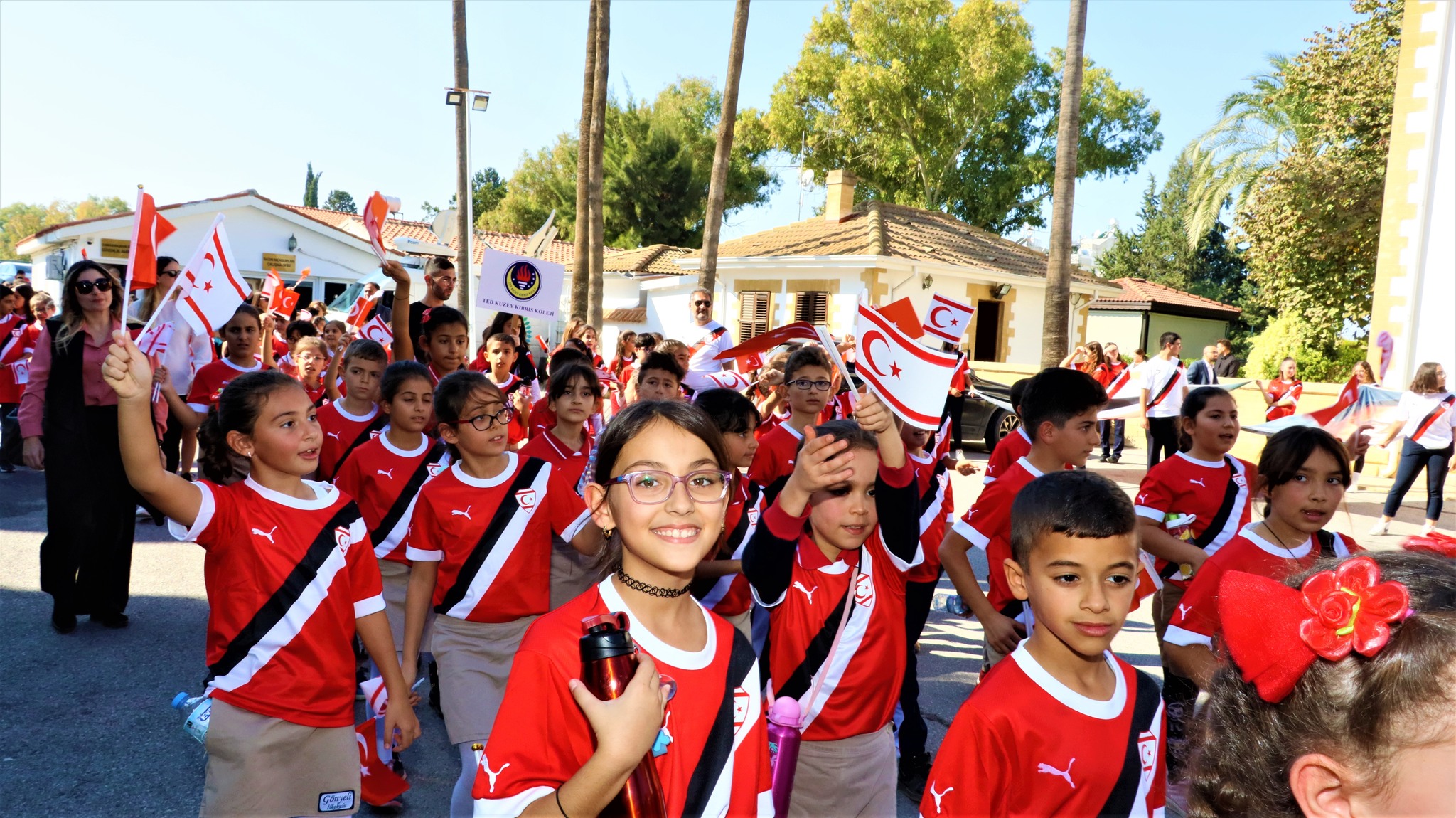 KKTC Milli Takım formalarının da giyildiği kortej yürüyüşü, Milli Eğitim Bakanlığı önünden başladı, Asal Şube, Girne Kapısı, Mahkemeler güzergâhını izlenerek, Cumhurbaşkanlığı’na ulaşıldı.