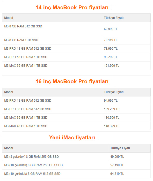 M3 işlemcili yeni MacBook Pro modellerinin fiyatı 62.999 TL’den başlıyor. M3 Max işlemcili ve 48 GB RAM’li tepe modelin fiyatı ise 148.399 TL olarak belirlenmiş.