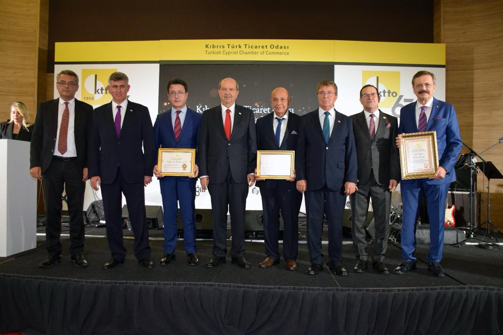 Gecede Türkiye Odalar ve Borsalar Birliği Başkanı ve Dünya Odalar Federasyonu Başkanı Rifat Hisarcıklıoğlu’na Kıbrıs Türk Ticaret Odası 65. Kuruluş Yılına Özel Yüksek Onur ve Hizmet Ödülü takdim edildi. Hisarcıklıoğlu’na ödülünü KKTC Cumhurbaşkanı Ersin Tatar ve Kıbrıs Türk Ticaret Odası Başkanı Turgay Deniz takdim etti.