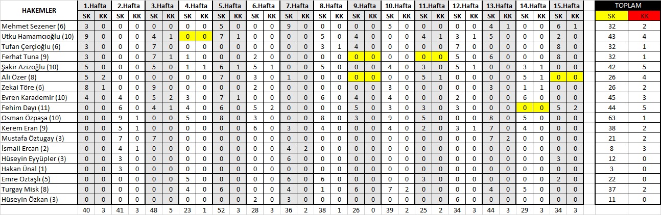 15 haftalık ilk devre maratonunda hakemler toplam 531 kez sarı kartına, 37 kez de kırmızı kartına başvurdu. En çok sarı kartı Osman Özpaşa çıkardı. Özpaşa 63 kez sarı kartına başvurdu.