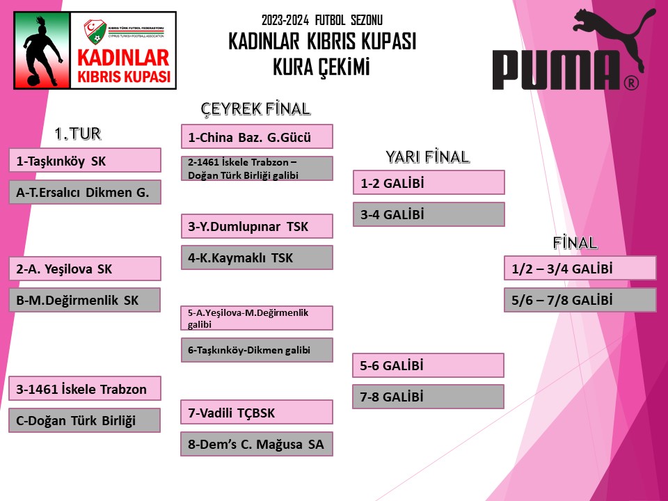 Kıbrıs Türk Futbol Federasyonu (KTFF) tarafından organize edilen Kadınlar Kıbrıs Kupası'nda eşleşmeler belli oldu. Finale kadar oluşacak tüm eşleşmeler belli olurken, kupada geçen sezonu ilk 5 sırada tamamlayan China Bazaar Gençlik Gücü , Dem's Cons. Mağusa Spor Akademisi, Yonpaş Dumlupınar , Küçük Kaymaklı ve Vadili doğrudan çeyrek final etabından kupaya başlayacak. Kupada 1.tur maçları 17 Ocak 2024 Çarşamba günü oynanacak.