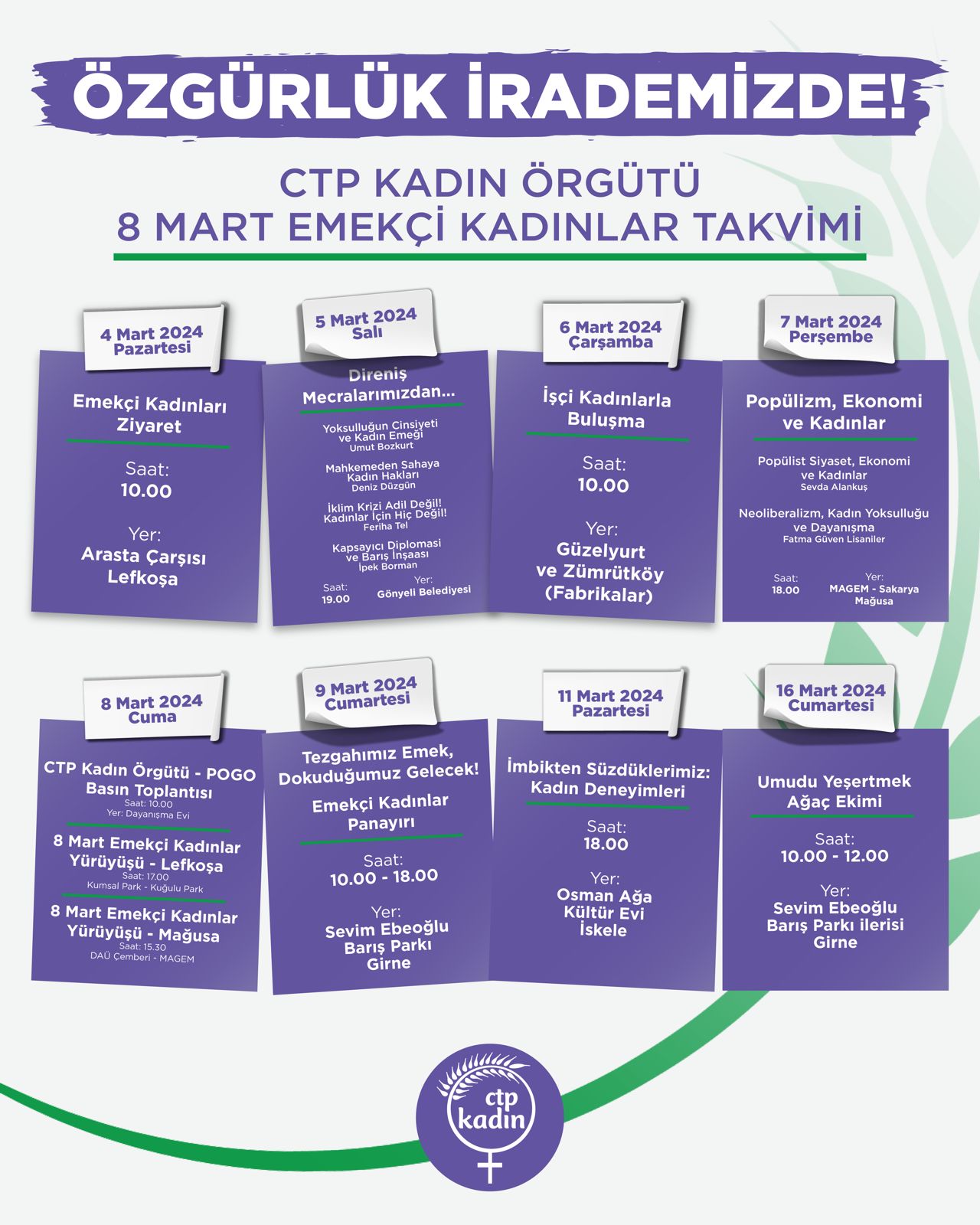 CTP Kadın Örgütü 8 Mart haftasına, 4 Mart’ta Lefkoşa Arasta çarşısında yapılacak “Emekçi Kadınlar Ziyareti” ile başlayacak. 5 Mart 2024 Salı günü düzenlenecek olan "Direniş Mecralarımızdan" konferansında, Umut Bozkurt, Deniz Düzgün, Feriha Tel ve İpek Borman kadın hakları, ekonomik adalet, iklim krizi ve barışın önemi gibi konuları ele alacak. Konferansın moderatörlüğünü ise Aslı Murat yapacak.