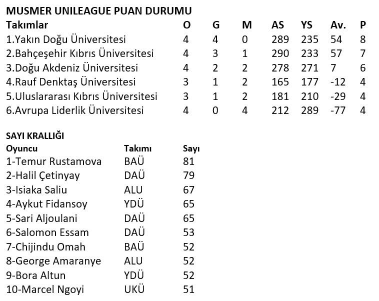 Musmer UniLeague’de 4. haftanın kapanış maçında lider Yakın Doğu Üniversitesi deplasmanda Rauf Denktaş Üniversitesi’ni 75-53’lük skorla yenerek, namağlup yoluna devam etti.