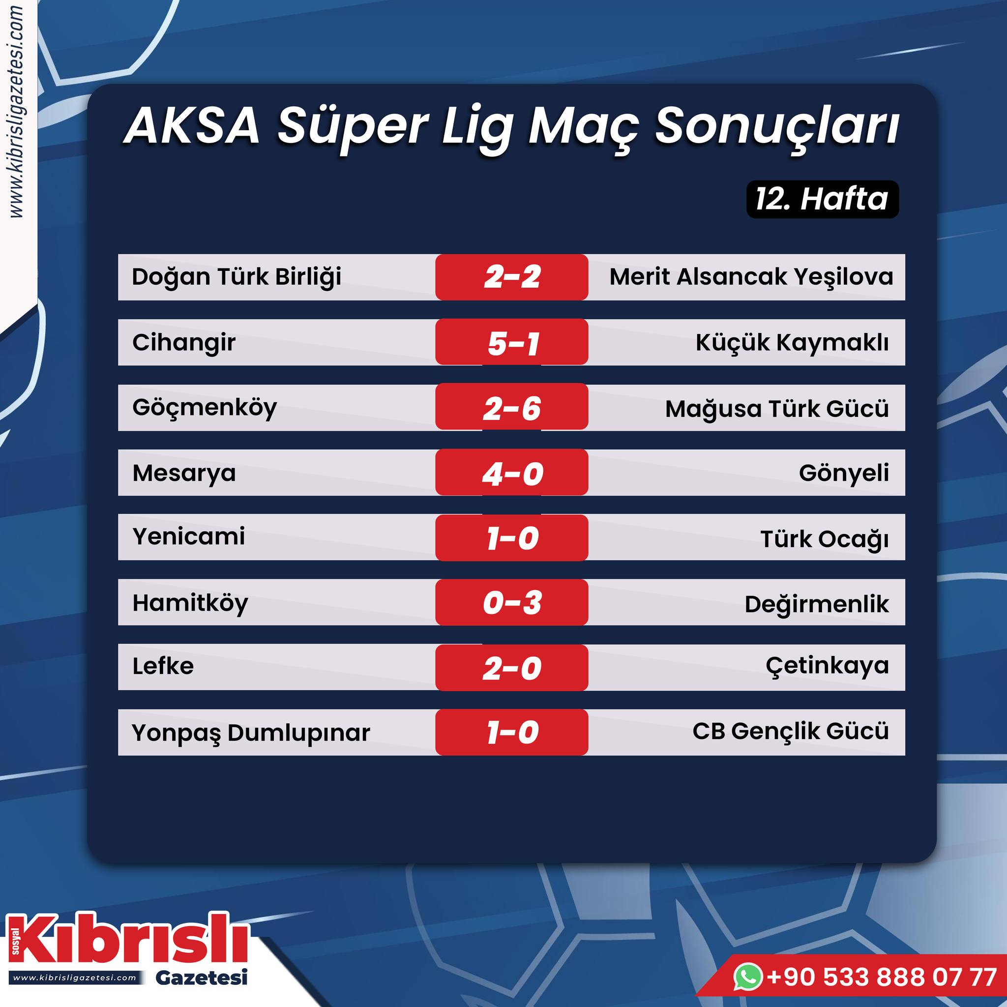 AKSA Süper Ligde 12'nci hafta mücadeleleri tamamlanırken, Mağusa Türk Gücü puan farkı ile liderliğini sürdürdü.