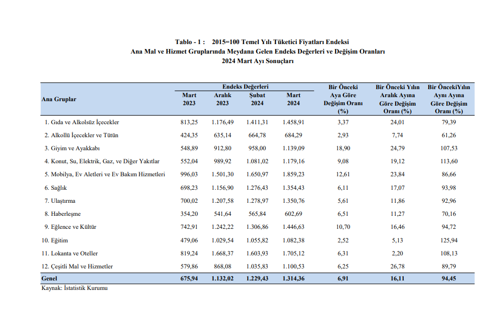İstatistik Kurumunun yayımladığı verilere göre, mart ayı hayat pahalılığı yüzde 6,91 olurken, bir önceki aralık ayına göre yüzde 16,11 ve geçtiğimiz yılın mart ayına göre ise yüzde 94,45 değişim oldu.