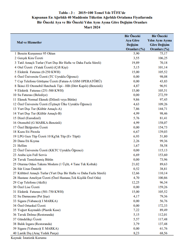 Ayrıca, bir önceki aya göre, endekste kapsanan 602 maddenin ortalama fiyatlarında artış, 64 maddenin ortalama fiyatlarında ise düşüş yaşandı. En yüksek fiyat artışı gösteren ilk üç mal; yüzde 200,33 ile DVD Player, yüzde 123,61 ile futbol maçına giriş ücreti ve yüzde 123,11 ile kavun oldu. En yüksek fiyat düşüşü gösteren ilk üç mal ise; yüzde 56,19 ile kabak, yüzde 44,74 ile taze bakla ve yüzde 32,43 ile çilek oldu.