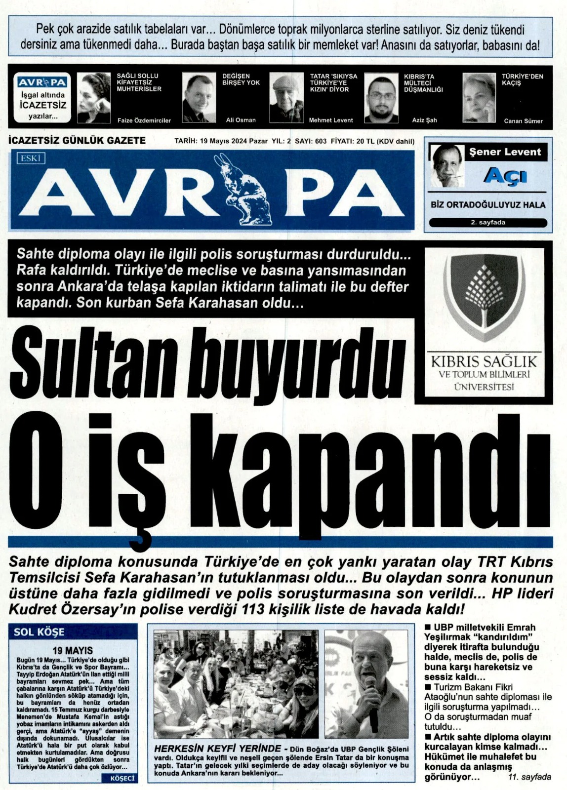 19 Mayıs 2024 Pazar Gazete Manşetleri