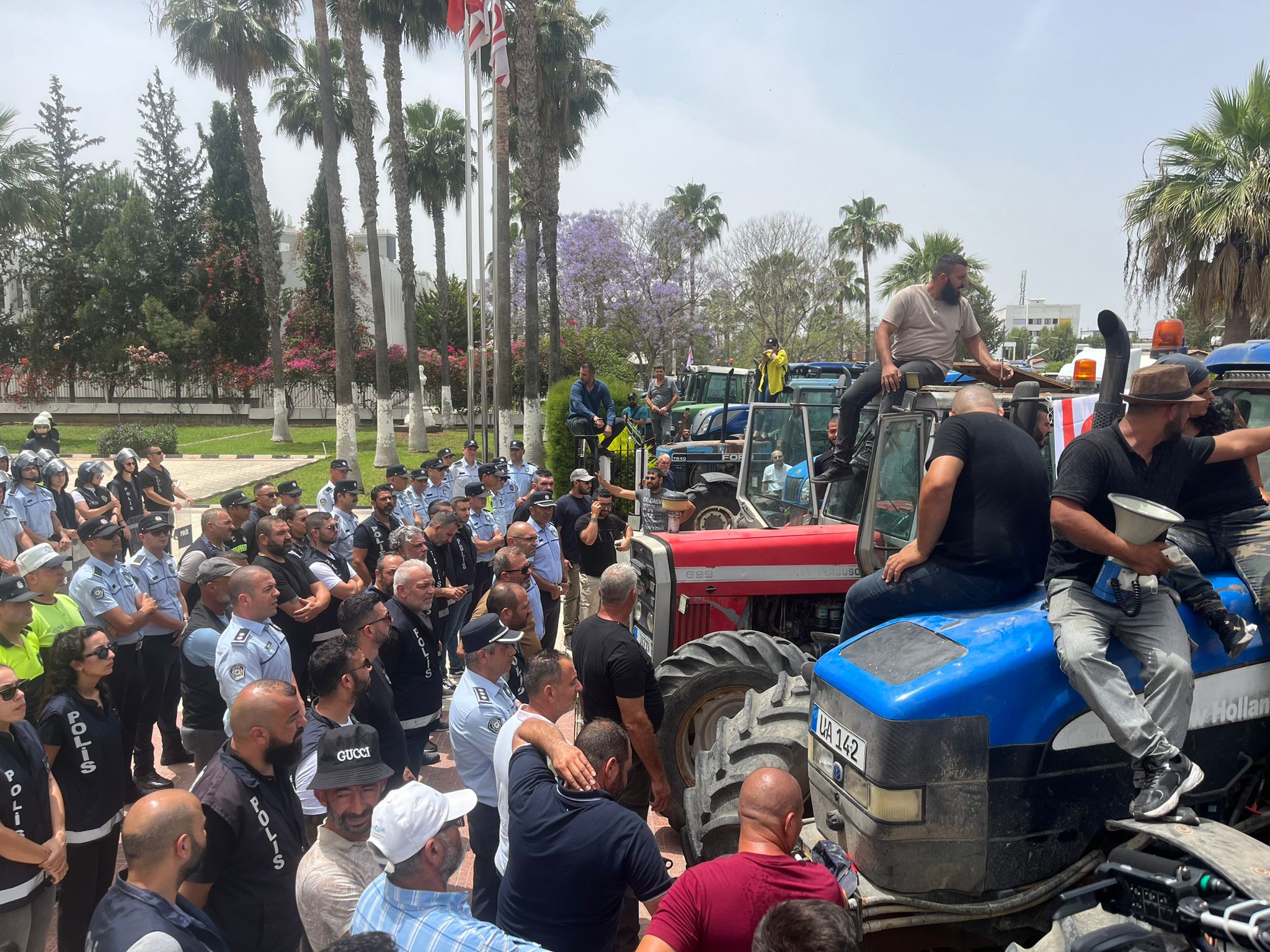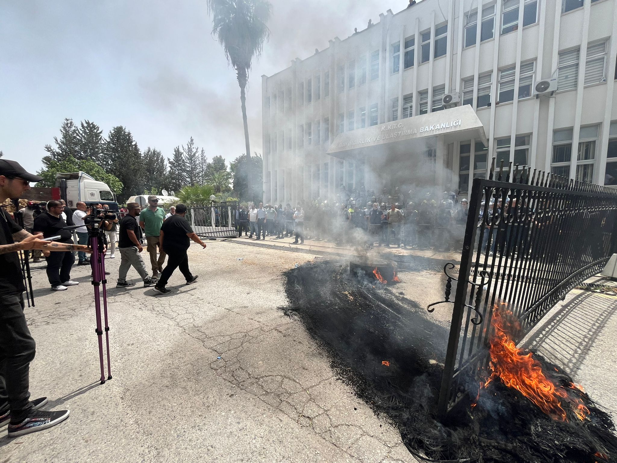 Hayvan Üreticileri ve Yetiştiricileri Birliği'nin pazartesi günü Lefkoşa’da başlattığı eylemi bugün de devam ediyor. Eylemciler, Bayındırlık ve Ulaştırma Bakanlığı'nın bahçe kapısını söktü, binaya yumurta attı, ateş yaktı. Buradaki eylemin ardından protestolar tekrar Başbakanlığa yöneldi.