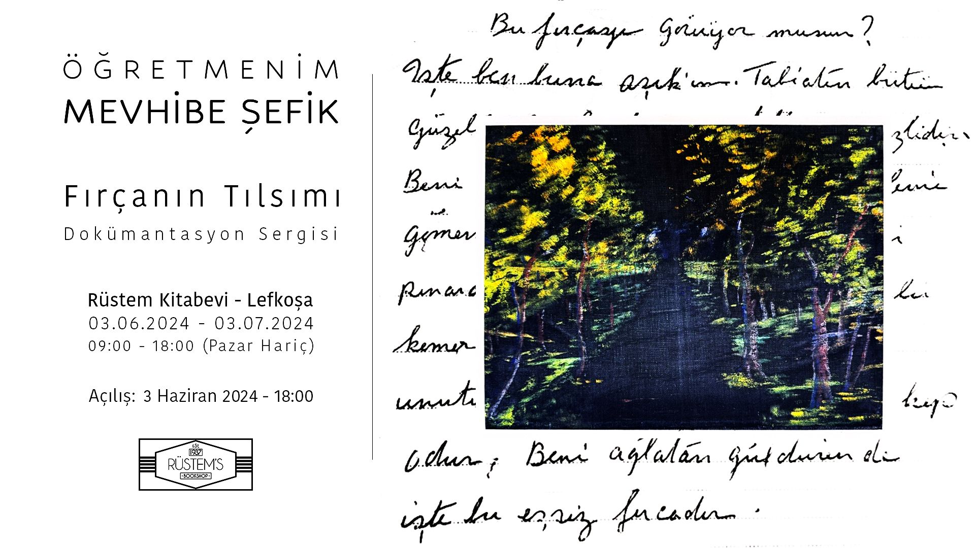 Rüstem Kitabevi, açılışı 3 Haziran 2024 Pazartesi akşamı saat 18:00’de sanat galerisinde gerçekleştirilecek ve 3 Temmuz 2024 tarihine kadar saat 09:00- 18:00 saatleri arasında ziyaret edilebilecek Öğretmenim Mevhibe Şefik- Fırçanın Tılsımı Dokümantasyon Sergisi’ni sanatseverler ile buluşturuyor.