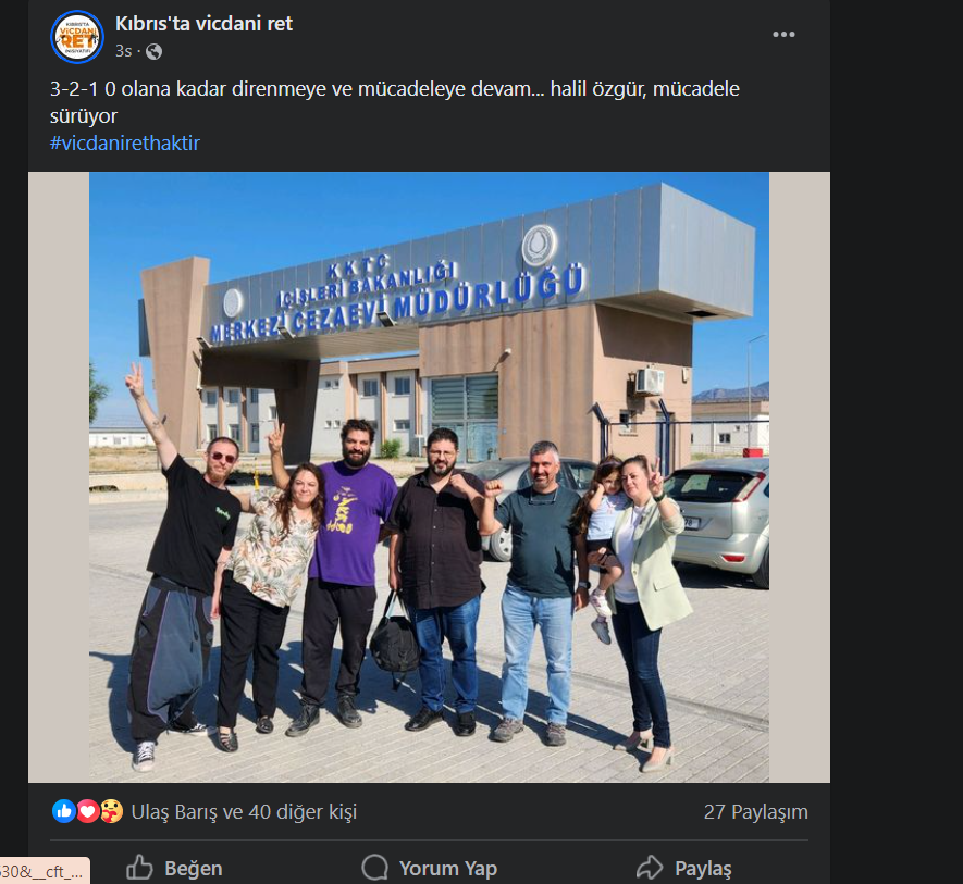 Kıbrıs’ta Vicdani Ret İnisiyatifi Sözcüsü Murat Kanatlı, konuyla ilgili yaptığı sosyal medya paylaşımında, "3-2-1 0 olana kadar direnmeye ve mücadeleye devam... halil özgür, mücadele sürüyor" ifadelerini kullandı.