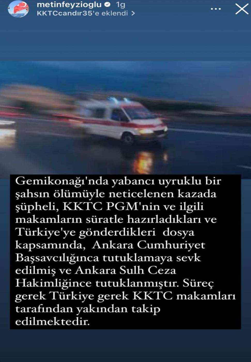 “Gemikonağı’nda yabancı uyruklu bir şahsın ölümüyle neticelenen kazada şüpheli, KKTC PGM’nin ve ilgili makamların süratle hazırladıkları ve Türkiye’ye gönderdikleri dosya kapsamında, Ankara Cumhuriyet Başsavcılığınca tutuklamaya sevk edilmiş ve Ankara Sulh Ceza Hakimliğince tutuklanmıştır. Süreç gerek Türkiye gerek KKTC makamları tarafından yakından takip edilmektedir”