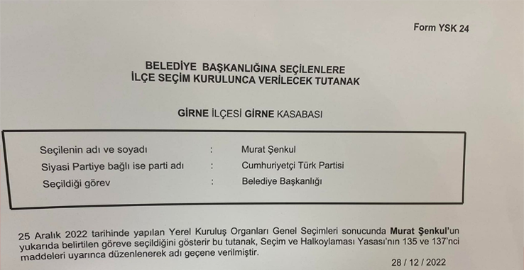 Girne Belediyesinin yeni başkanı Murat Şenkul, mazbatasını bugün aldı. Sosyal Medya hesabından paylaşımda bulunan Şenkul, “An itibarı ile resmî olarak Girne’de yaşayan tüm insanlarımızın hizmetkarıyım.” açıklamasında bulundu.