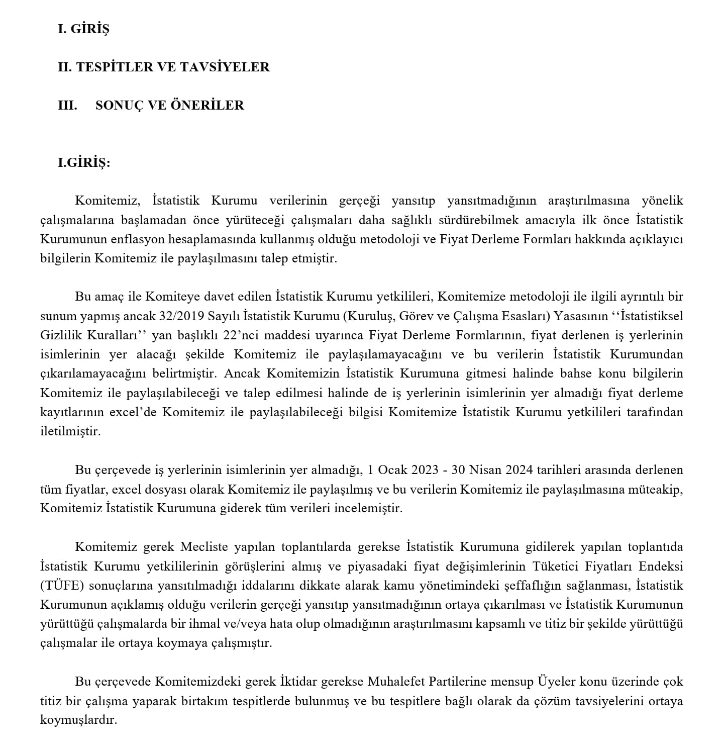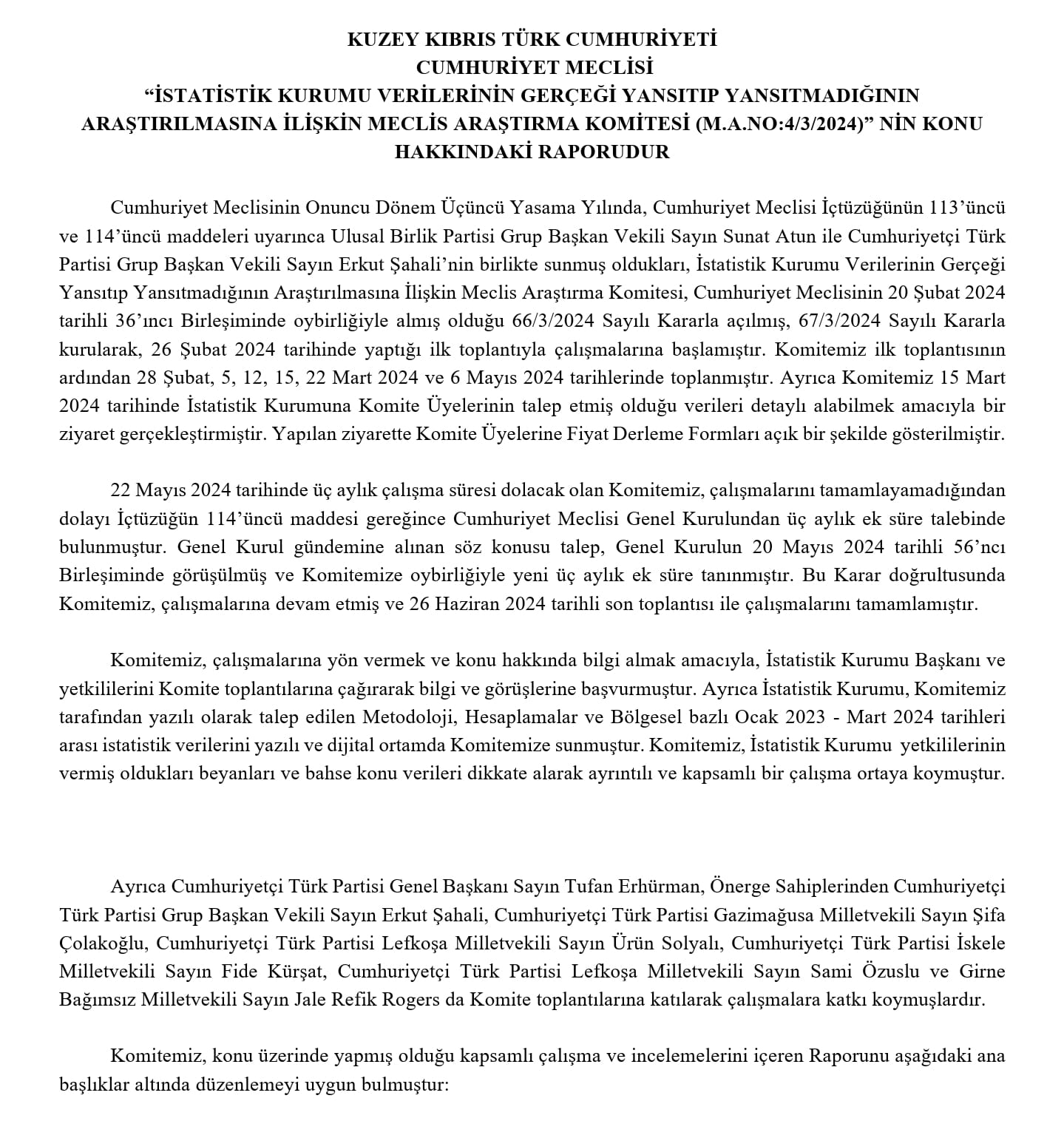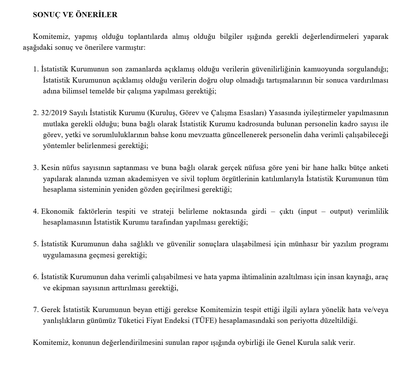 İstatistik Kurumu Verilerinin Gerçeği Yansıtıp Yansıtmadığının Araştırılmasına İlişkin Araştırma Komitesinin oy birliği ile onaylanan raporu dün mecliste okundu.