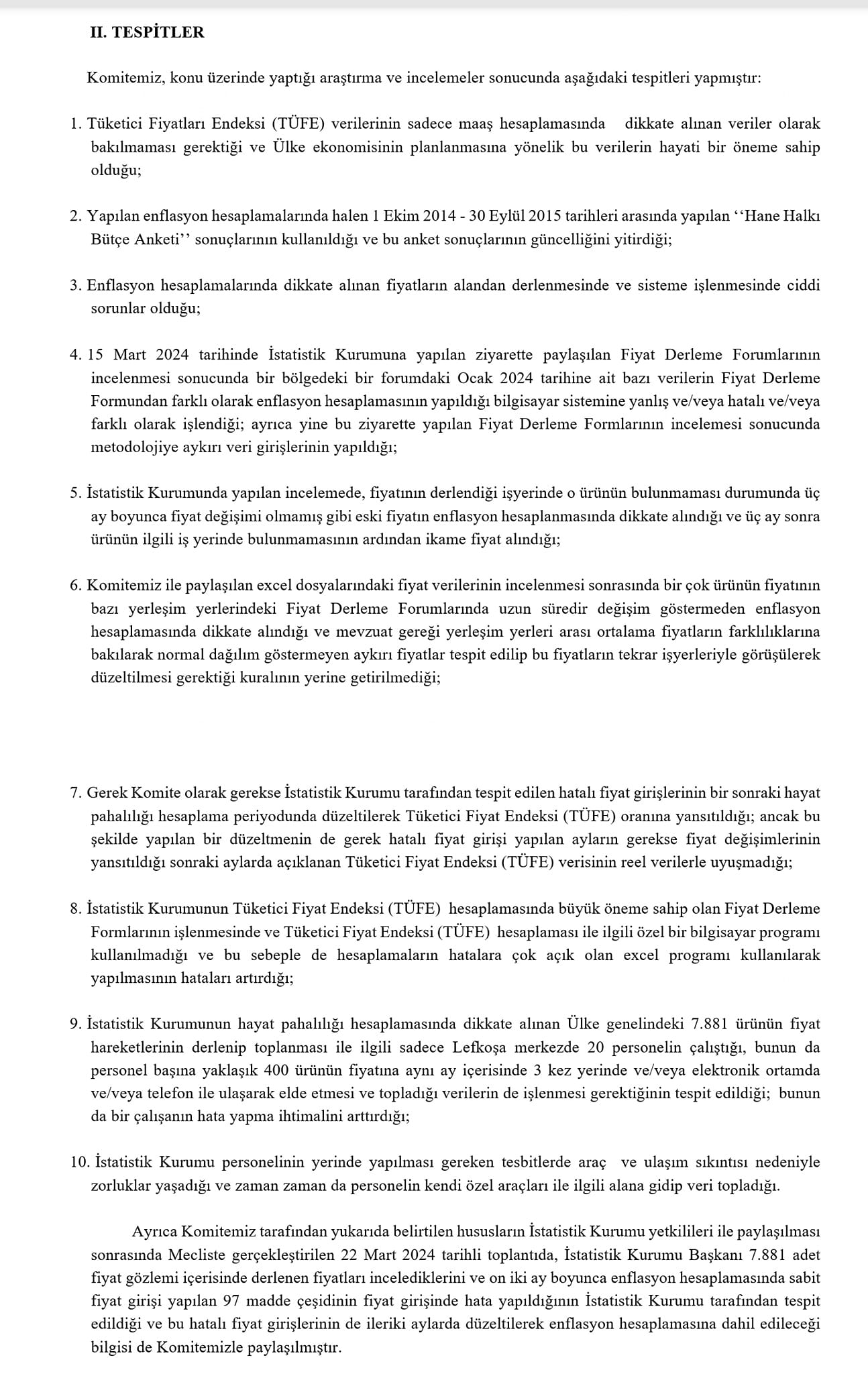 Komitemizin çalışmaları ve tespitleri sonrası İstatistik Kurumu yöneticileri, enflasyon hesaplamasında dikkate alınan 829 Madde Çeşidinin 97'sinin yani enflasyon hesaplamasında dikkate alınan madde çeşitlerinin %11.70'inin fiyatının bir yıl boyunca sabit tutulduğunu ve enflasyonun yanlış hesaplandığını kabul etmiştir.