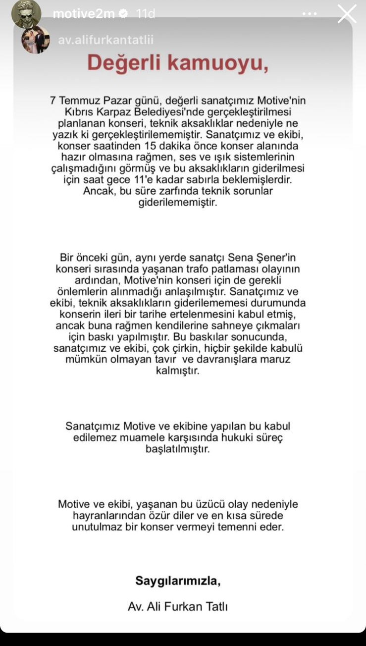 Motive'nin Avukatı Ali Furkan Tatlı, konserin teknik aksaklıklar sebebi ile gerçekleştiremediğini söyledi.