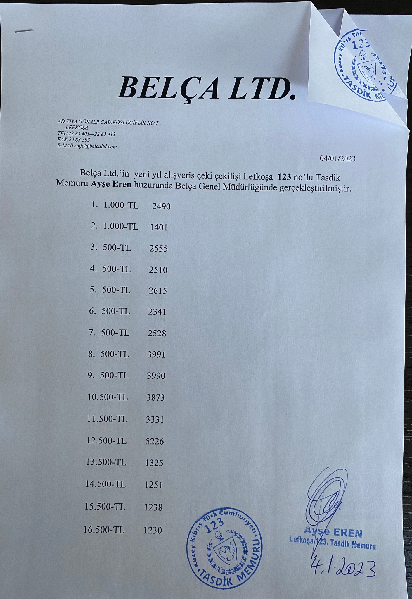 Belça Ltd.'in yeni yıl alışveriş çeki çekilişi Lefkoşa 123 No'lu Tasdik Memuru Ayşe Eren huzurunda Belça Genel Müdürlüğünde gerçekleştirildi.