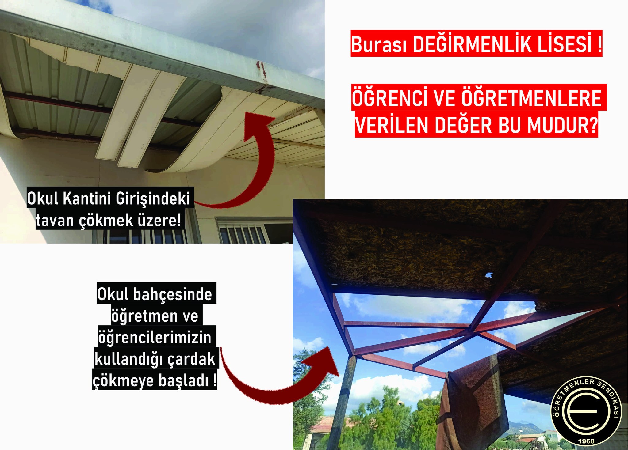 Beden eğitimi soyunma odalarının bakımsızlığı, 20 yılı aşkın süredir tamamlanamayan atıl durumdaki kapalı spor salonu inşaatını ve okulun belli bölgelerindeki tavan çöküntülerinin resmedildiği gönderide, KTOEÖS şu başlığı kullandı;