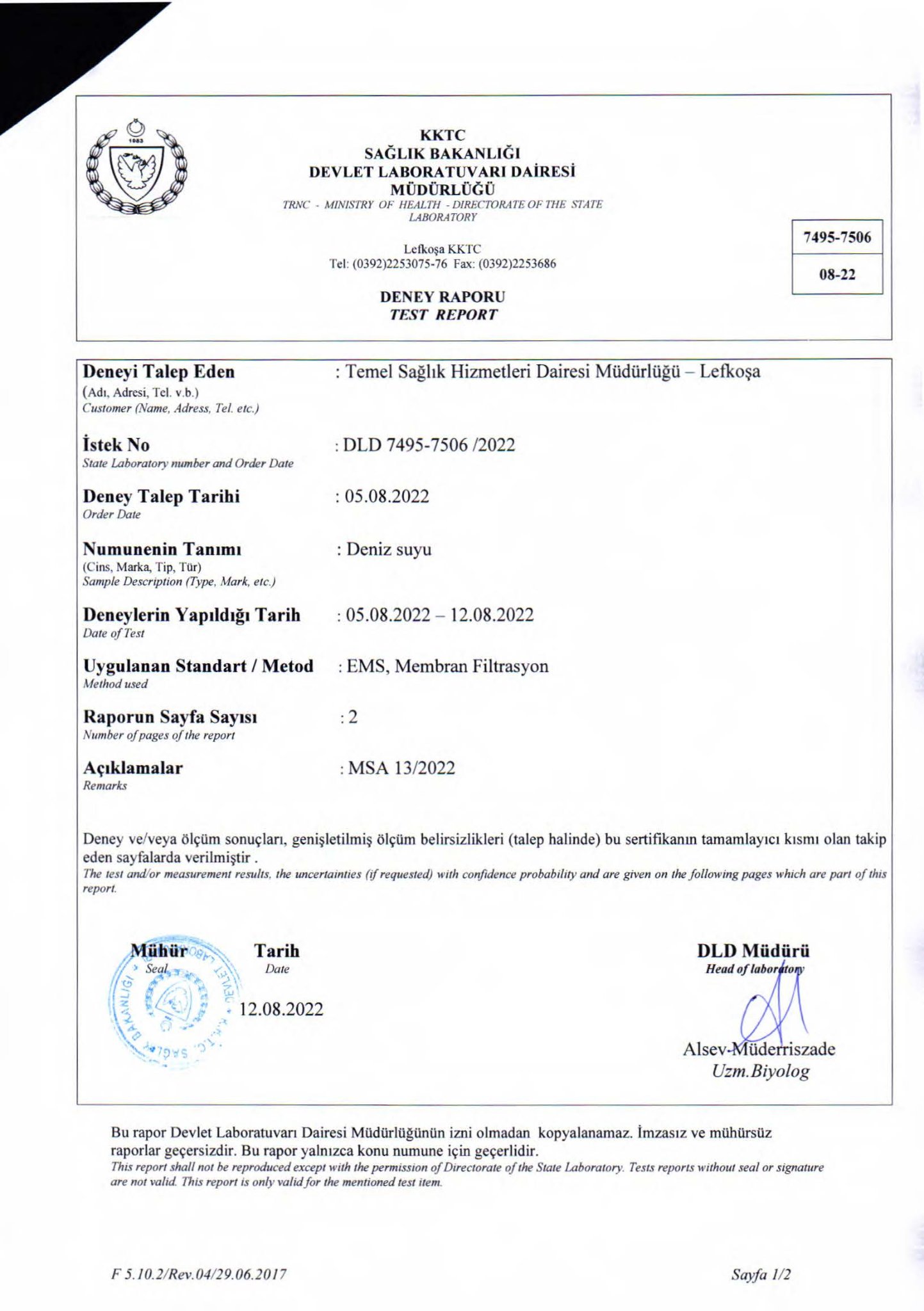 Sağlık Bakanlığı'na bağlı Temel Sağlık Hizmetleri Dairesi tarafından, Devlet Laboratuvarı'nda gerçekleştirilen Ağustos ayına ait deniz suyu analiz raporları ekte yer aldığı şekildedir. Diğer bölgelerle ilgili analiz sonuçları gelmeye devam ettikçe kamuoyu ile paylaşmaya devam edilecektir.