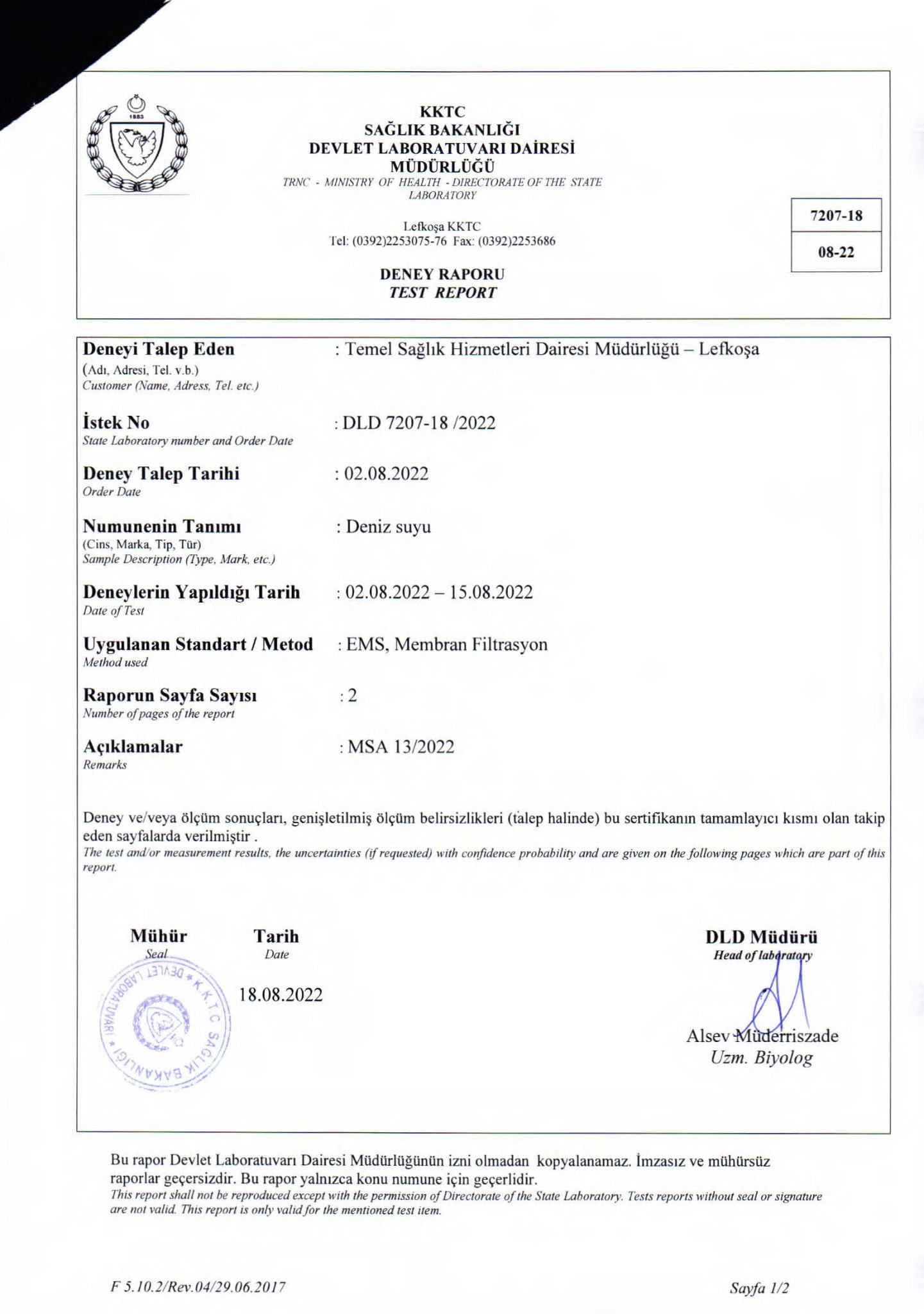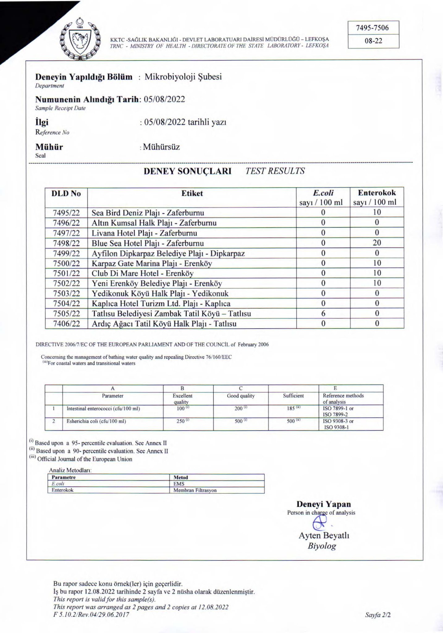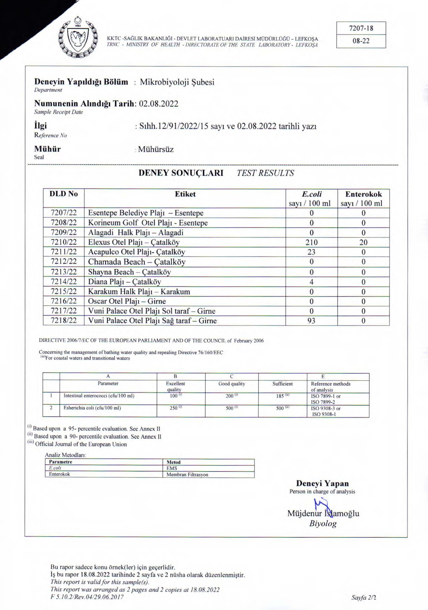 Sağlık Bakanlığı'na bağlı Temel Sağlık Hizmetleri Dairesi tarafından, Devlet Laboratuvarı'nda gerçekleştirilen Ağustos ayına ait deniz suyu analiz raporları ekte yer aldığı şekildedir. Diğer bölgelerle ilgili analiz sonuçları gelmeye devam ettikçe kamuoyu ile paylaşmaya devam edilecektir.