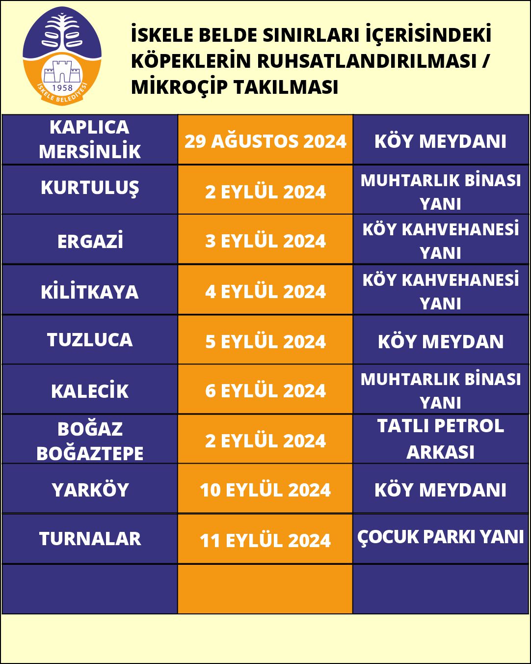 İşlem, açıklanan program uyarınca İskele ve köylerinde 12 Ağustos ile 11 Eylül arasında 09.00-12.00 saatleri arasında veteriner kontrolünde yapılacak.