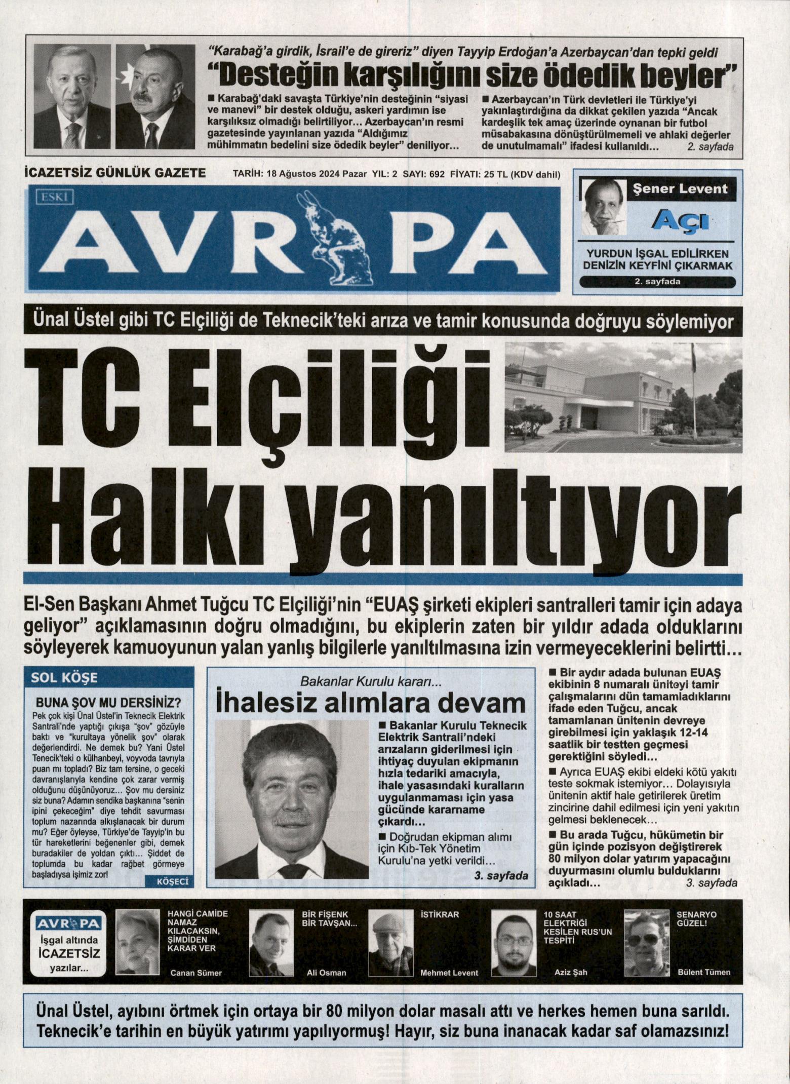 18 Ağustos 2024 Pazar gazete manşetleri