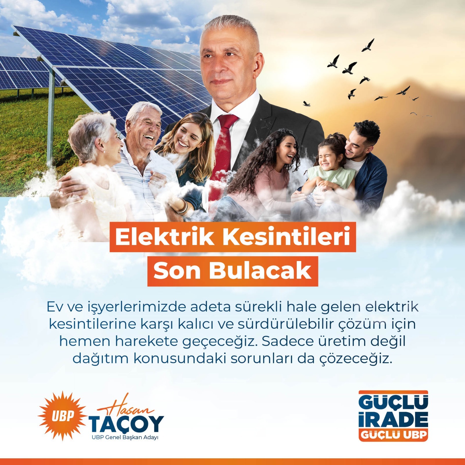 Ulusal Birlik Partisi (UBP) Milletvekili ve Genel Başkan Adayı Hasan Taçoy, yılın her mevsimi, günün her saatinde yaşanan elektrik kesintilerine dikkat çekti. Kesintilerin hem evlerde hem de işyerlerinde ve üretim alanlarında halkı hak etmediği bir yaşam biçimine indirgediğini belirten Taçoy, kesintilerin vatandaşı büyük sıkıntılarla karşı karşıya bıraktığını vurguladı.
