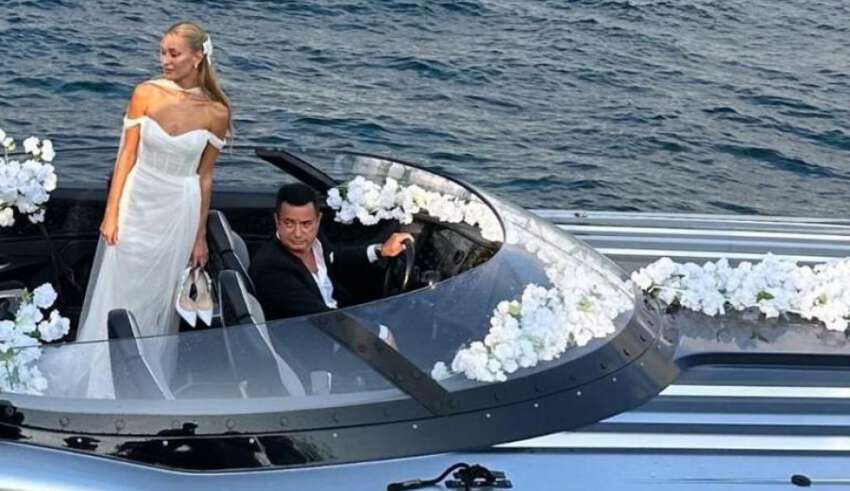 Gelin ve damat düğün töreninin yapılacağı mekana mekana tekne ile geldi. Çiçeği burnunda gelin Gelin Ayça Çağla Altunkaya, gelinliği ile göz kamaştırdı.
