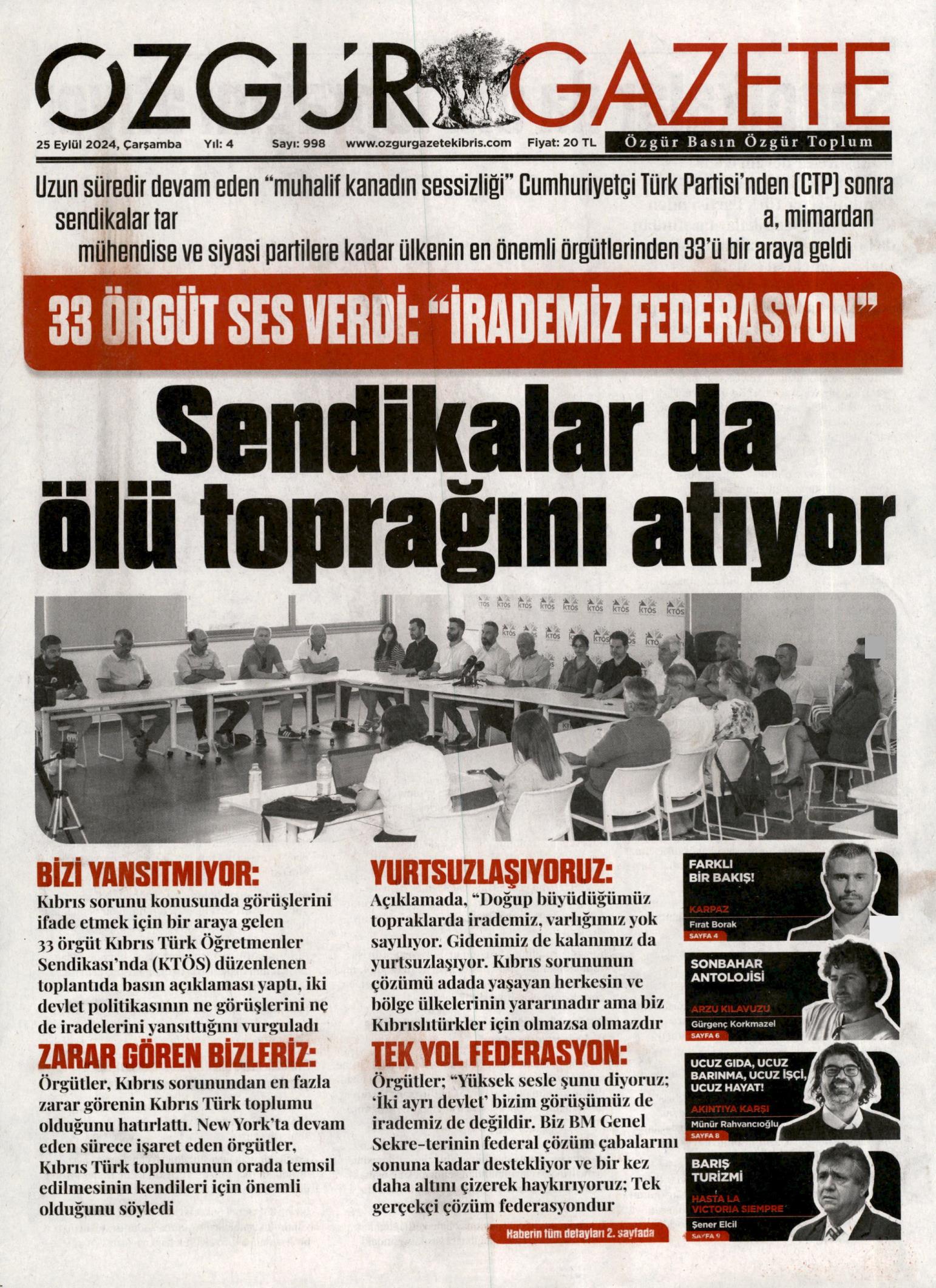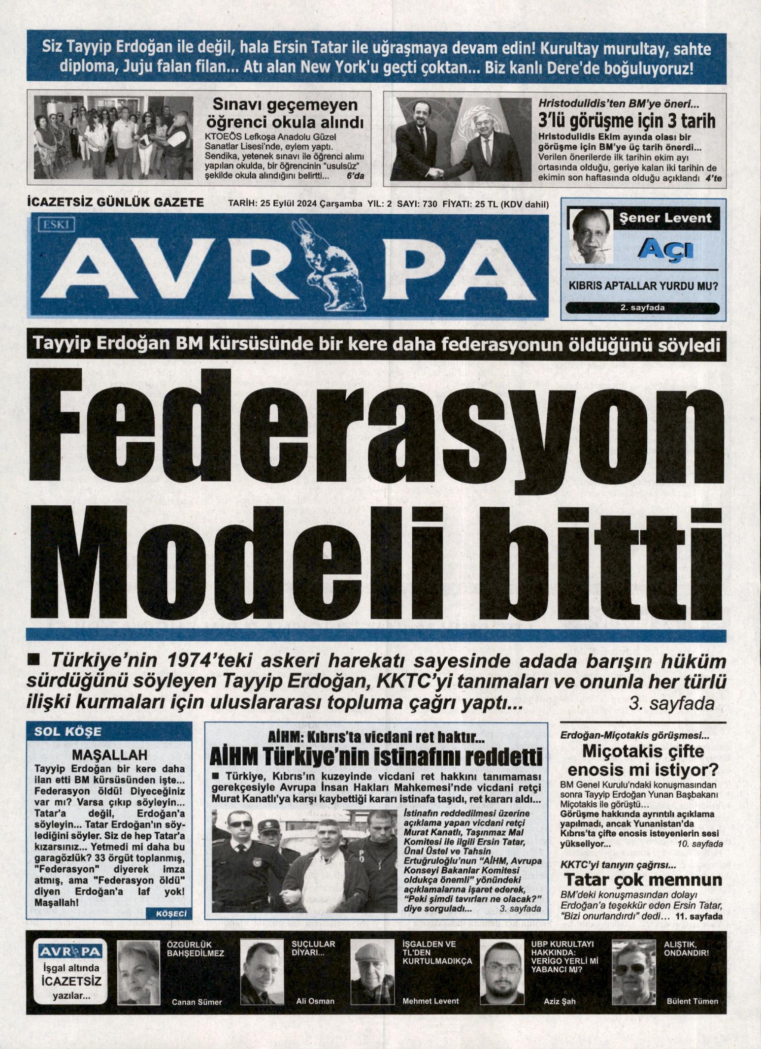 25 Eylül 2024 Çarşamba Gazete Manşetleri