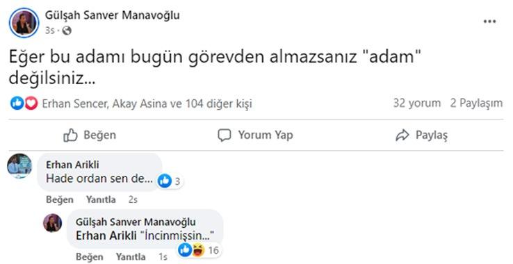 Manavoğlu’nun sosyal medya hesabından “Eğer bu adamı bugün görevden almazsanız “adam” değilsiniz” açıklamasına Arıklı “Hade Ordan Sende” cevabını verdi. Bu cevap üzerine Manavoğlu “İncinmişsin” olarak karşılık verdi.