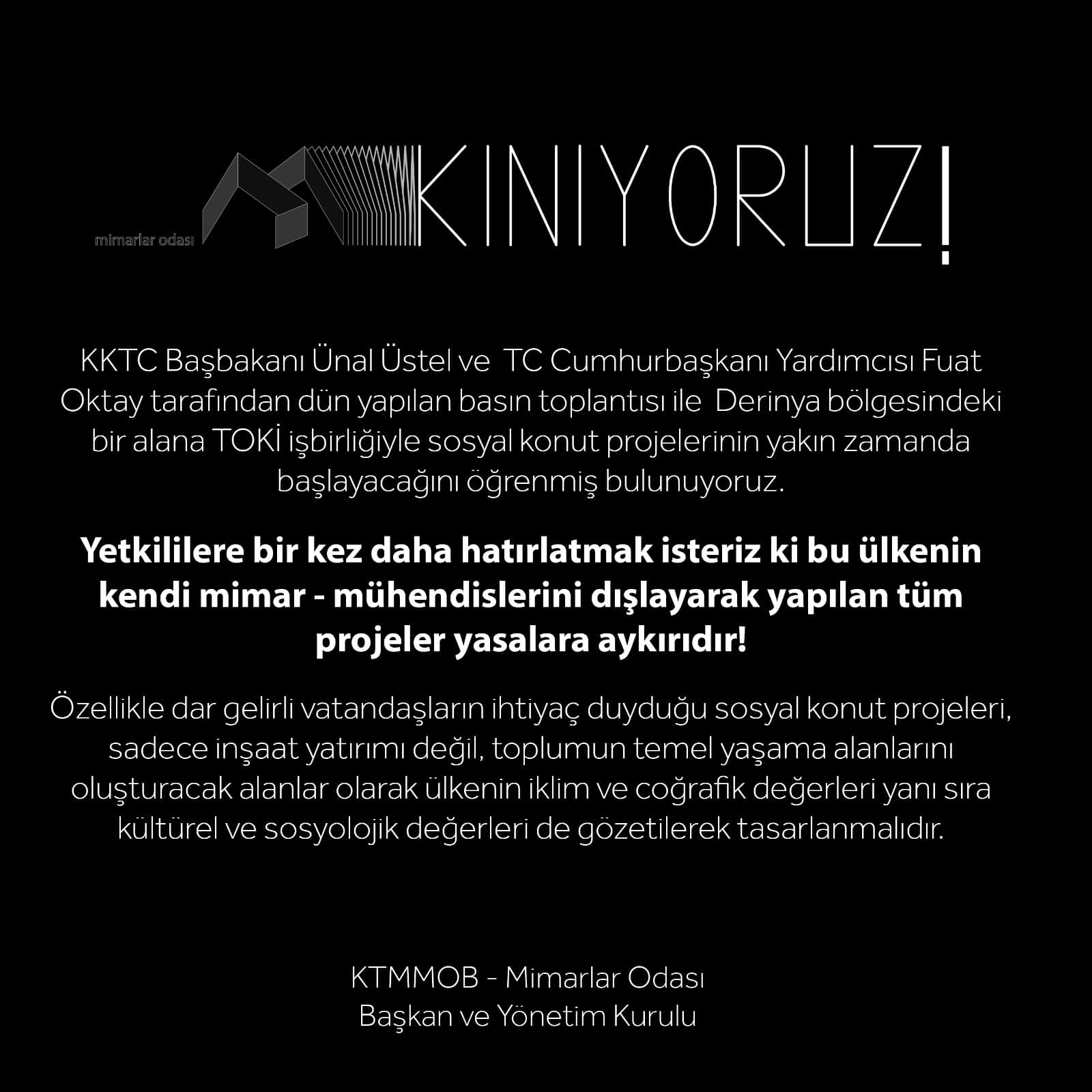 Kıbrıs Türk Mimar Mühendis Odalar Birliği (KTMMOB) ve Mimarlar Odası tarafından yapılan açıklamada Derinya bölgesindeki bir alana sosyal konut projesinin TOKİ tarafından yapılmasını kınadıklarını belirttiler.