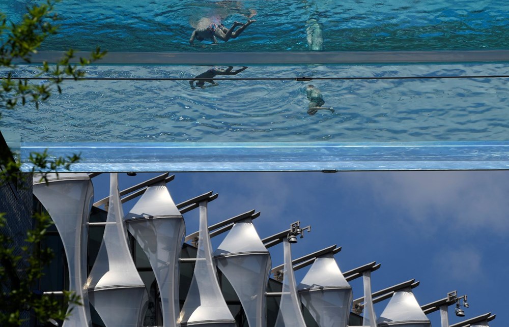 Nine Elms semtinde bulunan Embassy Garden bloklarının 10'uncu katlarının arasına inşa edilen dünyanın ilk transparan gökyüzü havuzu 19 Mayıs'ta faaliyete geçmişti. Yerden yaklaşık 35 metre yükseklikte bulunan havuz, 25 metre uzunluğa, 5 metre genişliğe, 3 metre derinliğe ve 400 ton su kapasitesine sahip. Yüzmenin cesaret istediği havuz, fotoğrafçı Jason Hawkes tarafından drone ile havadan görüntülendi. Sadece Embassy Garden sakinleri ve misafirlerinin kullanımına açık olan havuzdan, London Eye, Parlamento binası ve Thames Nehri görülüyor. Havuzun tabanı, yaklaşık 12 inç kalınlığında olmasına rağmen tamamen şeffaf olurken, şiddetli rüzgarlarda hareket etmesini sağlayan özel bir teknoloji kullanılarak inşa edildi. ABD Büyükelçiliği binasının yanında yer alan Embassy Garden'da çatı katı süit daireler ise 5 milyon Pound'asatılıyor.