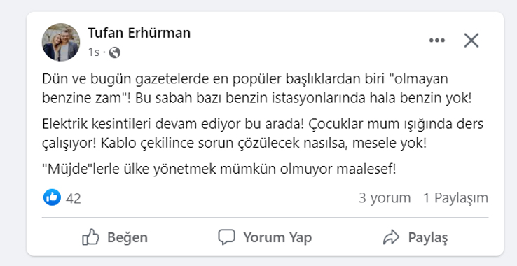 Cumhuriyetçi Türk Partisi (CTP) Genel Başkanı Tufan Erhürman sosyal medya hesabından "Müjde"lerle ülke yönetmek mümkün olmuyor maalesef!" diyerek devlet yetkililerine eleştiride bulundu.
