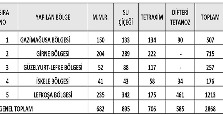 KKTC Sağlık Bakanlığı Temel Sağlık Hizmetleri Dairesi, 2022-2023 eğitim ve öğretim yılı Milli Eğitim Bakanlığı’na bağlı ilkokul 1 ve 5'nci sınıf öğrencilerine Aşı Kampanyası kapsamında, KKTC genelindeki ilkokullarda çocukluk aşılarını tamamlanmış olup, bu kapsamda 2868 doz aşı yapıldığını açıkladı.