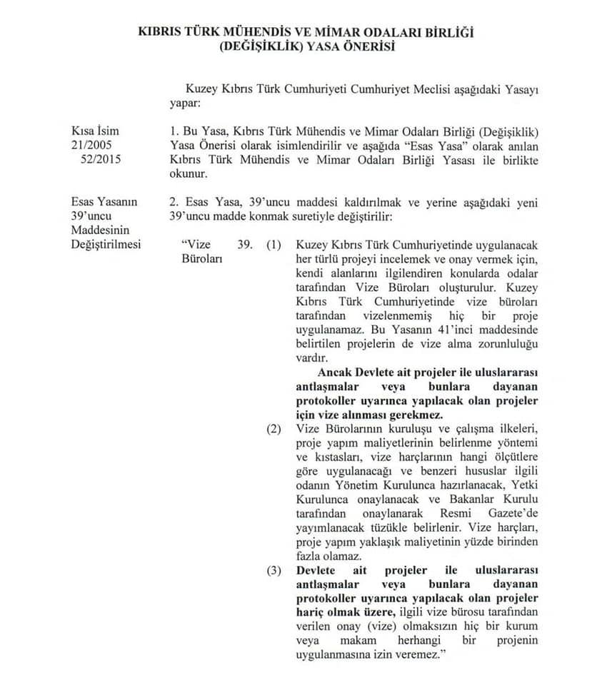 Hükümet, Kıbrıs Türk Mühendis ve Mimar Odaları Birliği (KTMMOB) Yasası’nı, Birlik yetkililerine danışmaksızın değiştirmek için yasa önerisi hazırladı.Yasa önerisine göre, KTMMOB’nin devletlerarası ve uluslararası anlaşmalarda vize verme şartı kaldırılıyor.Öneride, “Devlete ait projeler ile uluslararası antlaşmalar veya bunlara dayanan protokoller uyarınca yapılacak projeler için vize alınması gerekmez” ifadeleri yer alıyor.