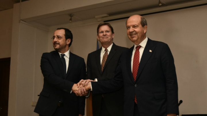 Stewart’ın konuşmasının ardından Stewart, Tatar ve Hristodulidis birlikte el ele basına poz verdi.