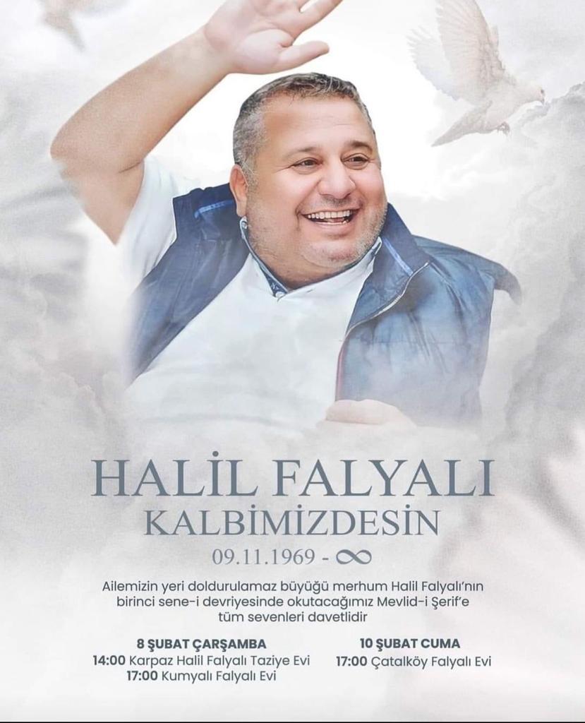 Yapılan davette, “Ailemizin yeri doldurulamaz büyüğü merhum Halil Falyalı’nın birinci yılı sene-i devriyesinde okutacağımız mevlit-i şerife tüm sevenleri davetlidir” denildi.