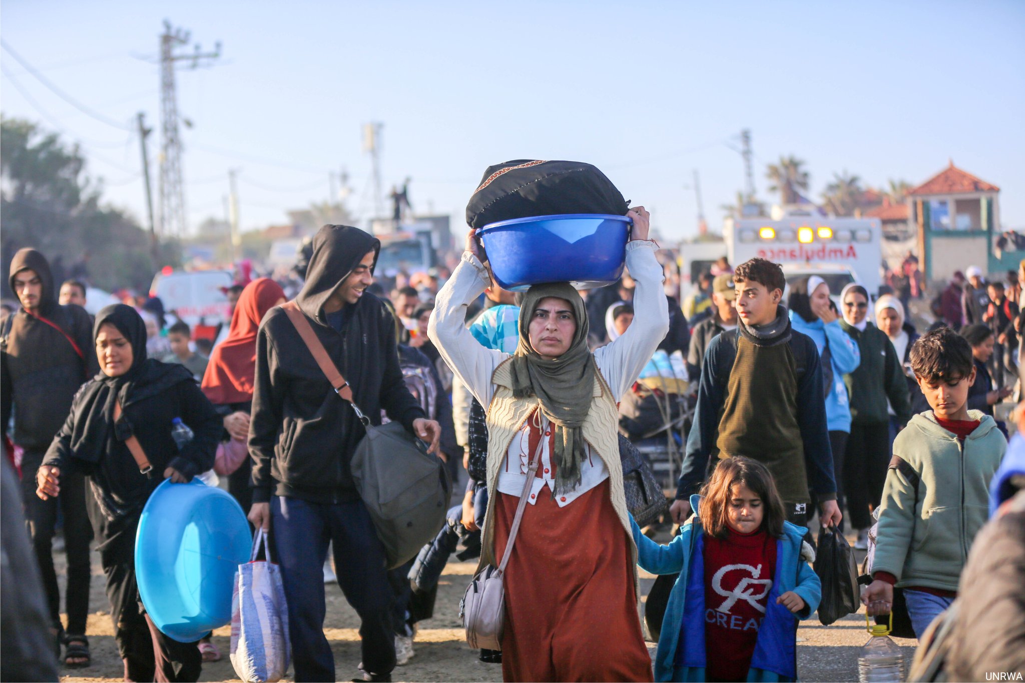 Sırt çantaları taşıyan çocuklar el ele yürüdü. Erkekler tekerlekli sandalyedeki yaşlıları itti ve kırmızı yelekli Hamas görevlileri yol boyunca onları yönlendirirken aileler fotoğraf çektirdi.