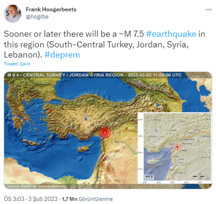 Türkiye, bugün sabaha karşı Kahramanmaraş’ın Pazarcık merkezli 7.4 büyüklüğündeki depremle sarsıldı. Depremin ardından, gökbilimci Frank Hoogerbeets’in 3 Şubat günü yaptığı paylaşım sosyal medyada konu oldu.