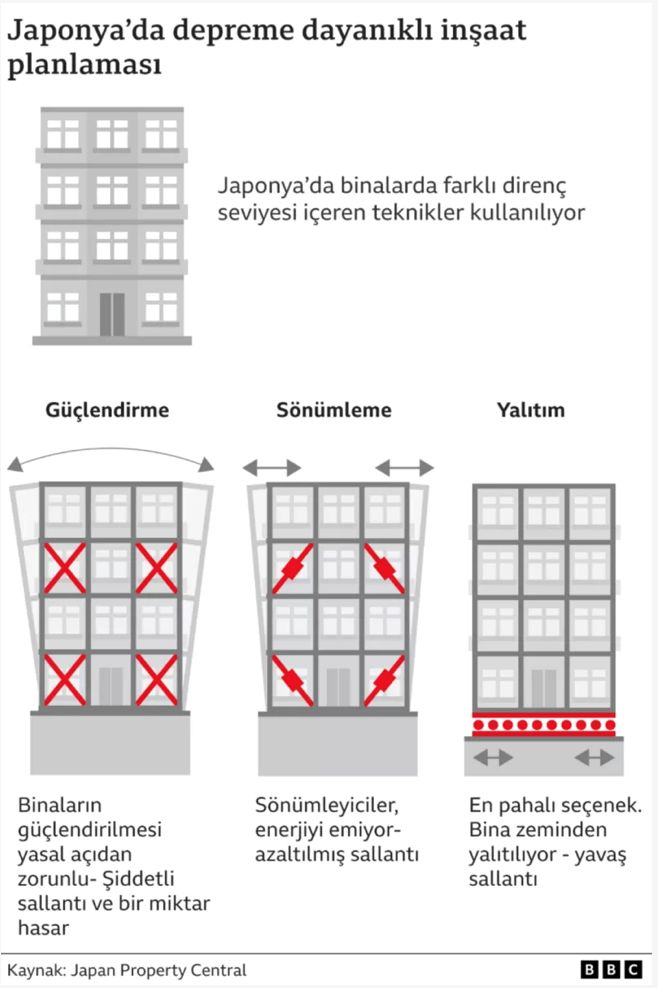 Sütçü, ayrıca Japonya’da depreme dayanıklı evler ve binaların depremle beraber sallanacak şekilde inşa edildiğini anlatıyor. Bu tür binalardan Japonya’da 8,000 adet, Türkiye’de ise 100 adet olduğunu söylüyor. Bunlardan dördü, İstanbul'daki Başakşehir Çam Sakura Şehir Hastanesi gibi hastane olarak hizmet veriyor.