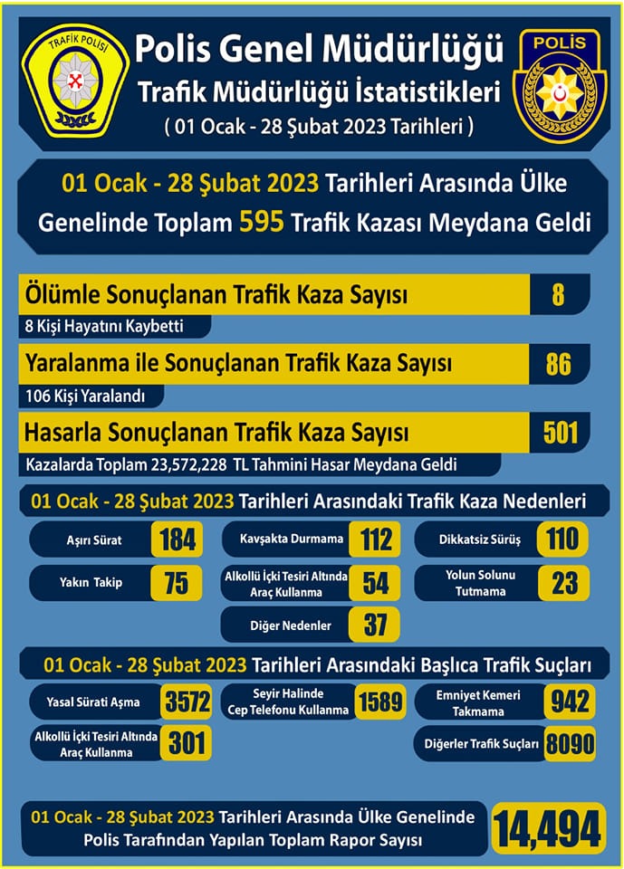 Polis Genel Müdürlüğü 1 Ocak-28 Şubat 2023 tarihlerini kapsayan trafik istatistiklerini açıkladı.