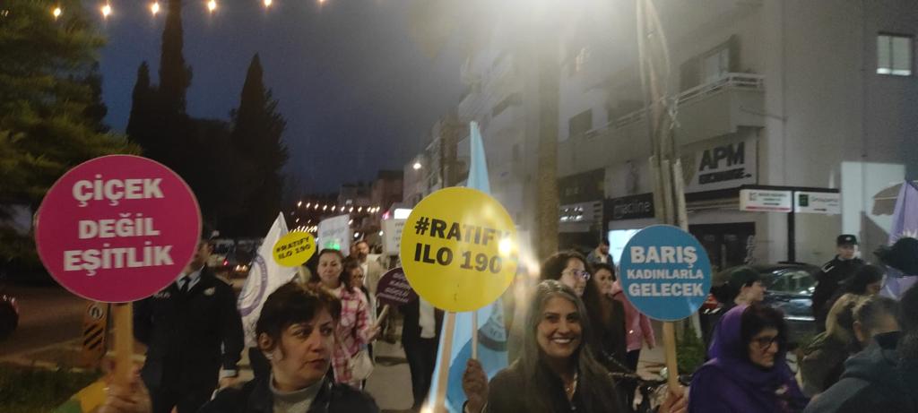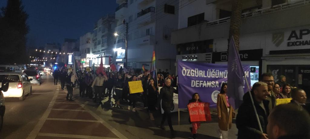 Yürüyüşe katılmak üzere saat 17.30’da Kumsal Park’ta toplanan kitle, “Eşitlikten vazgeçmiyoruz”; “Susmuyoruz, korkmuyoruz, itaat etmiyoruz”; “Yakamadığınız cadıların angonileriyiz”; “Özgürlüğünü seven defansa gelsin”; “Erkek şiddetine son”; “Çiçek değil, eşitlik”; “Gericilikten korkma, geç kalmaktan kork”; “Eşit ve özgür bir yaşam için hesaplaşacağız” yazılı pankartlar taşıdı. KTOEÖS Yönetim Kurulu Üyesi Çağrı Arslan, Meclis önünde örgütlerin ortak basın açıklamasını okudu.