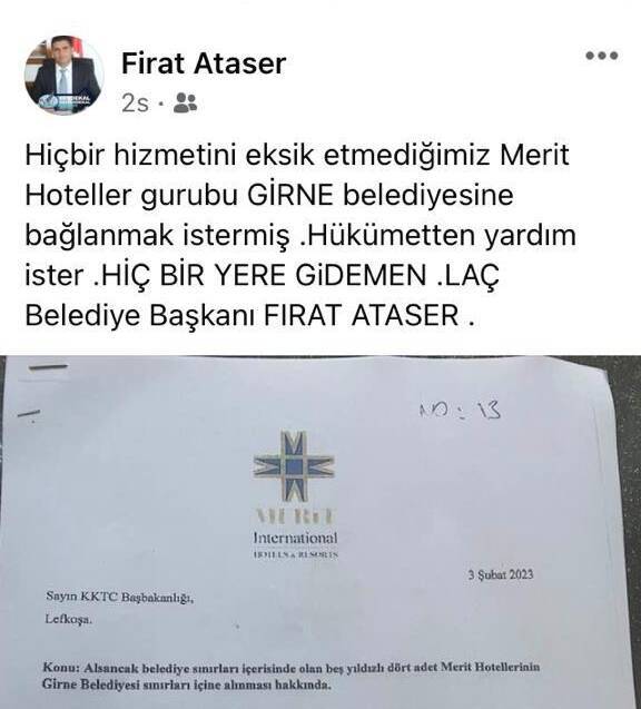Ataser ise yaptığı paylaşımda, “Hiçbir hizmetini eksik etmediğimiz Merit Hoteller gurubu GİRNE belediyesine bağlanmak istermiş. Hükümetten yardım ister. Hiçbir yere gidemen” dedi.