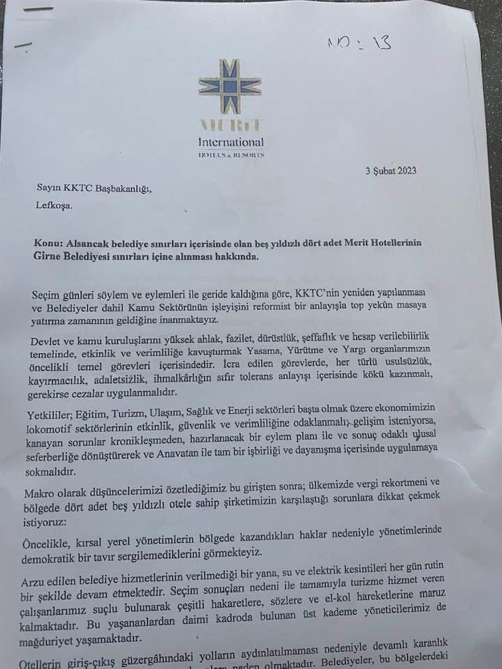 Merit Hoteller Grubu, Alsancak belediye sınırları içinde olan 4 adet otelin Girne Belediyesi sınırlarına alınması için Başbakanlığa talepte bulundu.