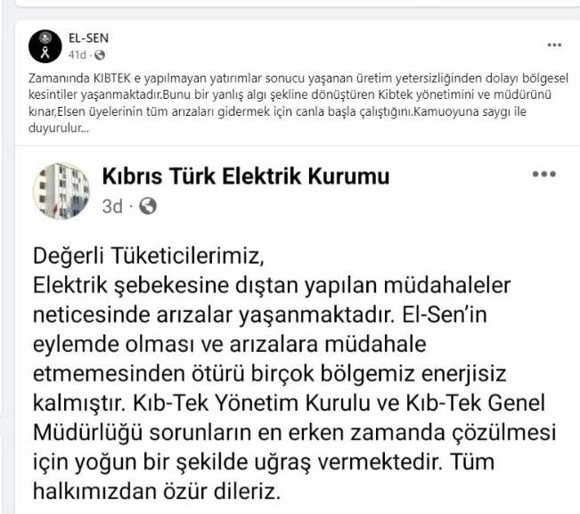 Kıbrıs Türk Elektrik Kurumu’nun yaşanan elektrik kesintileri sonrasında “El-Sen’in eylemde olması ve arızalara müdahale etmemesinden ötürü birçok bölgemiz enerjisiz kalmıştır.