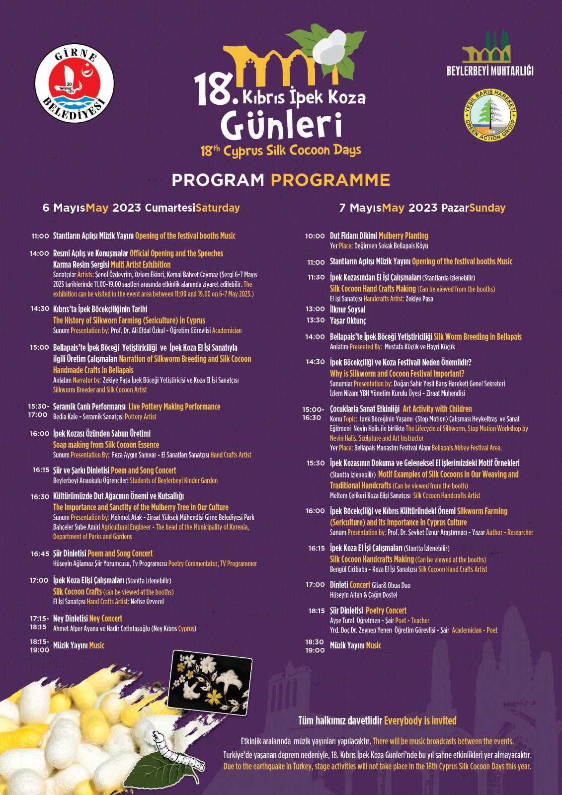 Kıbrıs İpek Koza Günleri’nde, geçmiş organizasyonlarda yer verilen canlı müzik folklor gibi sahne etkinliklerine, Türkiye’de yaşanan deprem nedeniyle yer verilmeyecek.