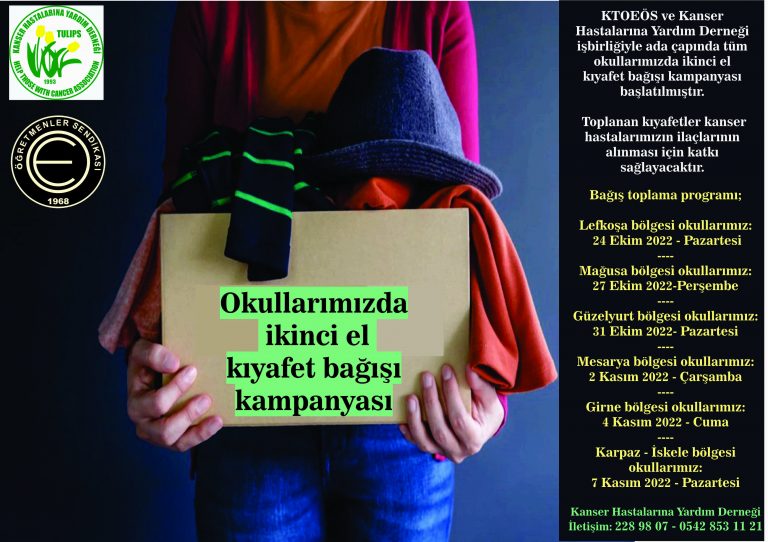 Kıbrıs Türk Orta Eğitim Öğretmenler Sendikası (KTOEÖS), Kanser Hastalarına Yardım Derneği-TULİPS çağrısıyla sendikanın işbirliği içerisinde ada çapında tüm okullarda ikinci el kıyafet bağışı kampanyası başlattı.