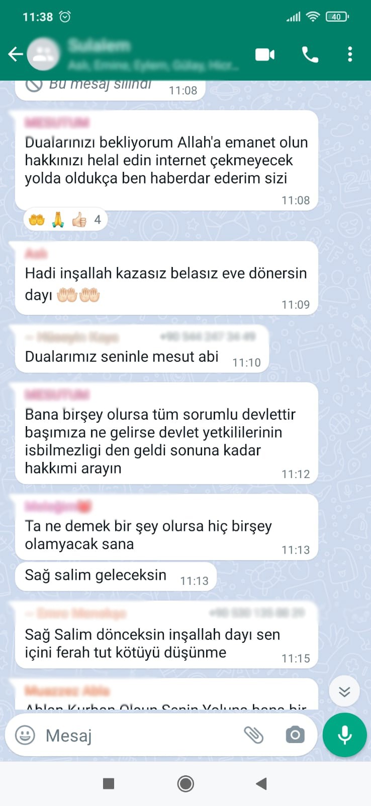 Mensur Kaya son mesajında şunları yazdı: Dualarınızı bekliyorum Allah'a emanet olun hakkınızı helal edin internet çekmeyecek yolda oldukça ben haberdar ederim sizi. Bana bir şey olursa tüm sorumlu devlettir başımıza ne gelirse devlet yetkililerinin iş bilmezliğinden geldi sonuna kadar hakkı mı arayın"